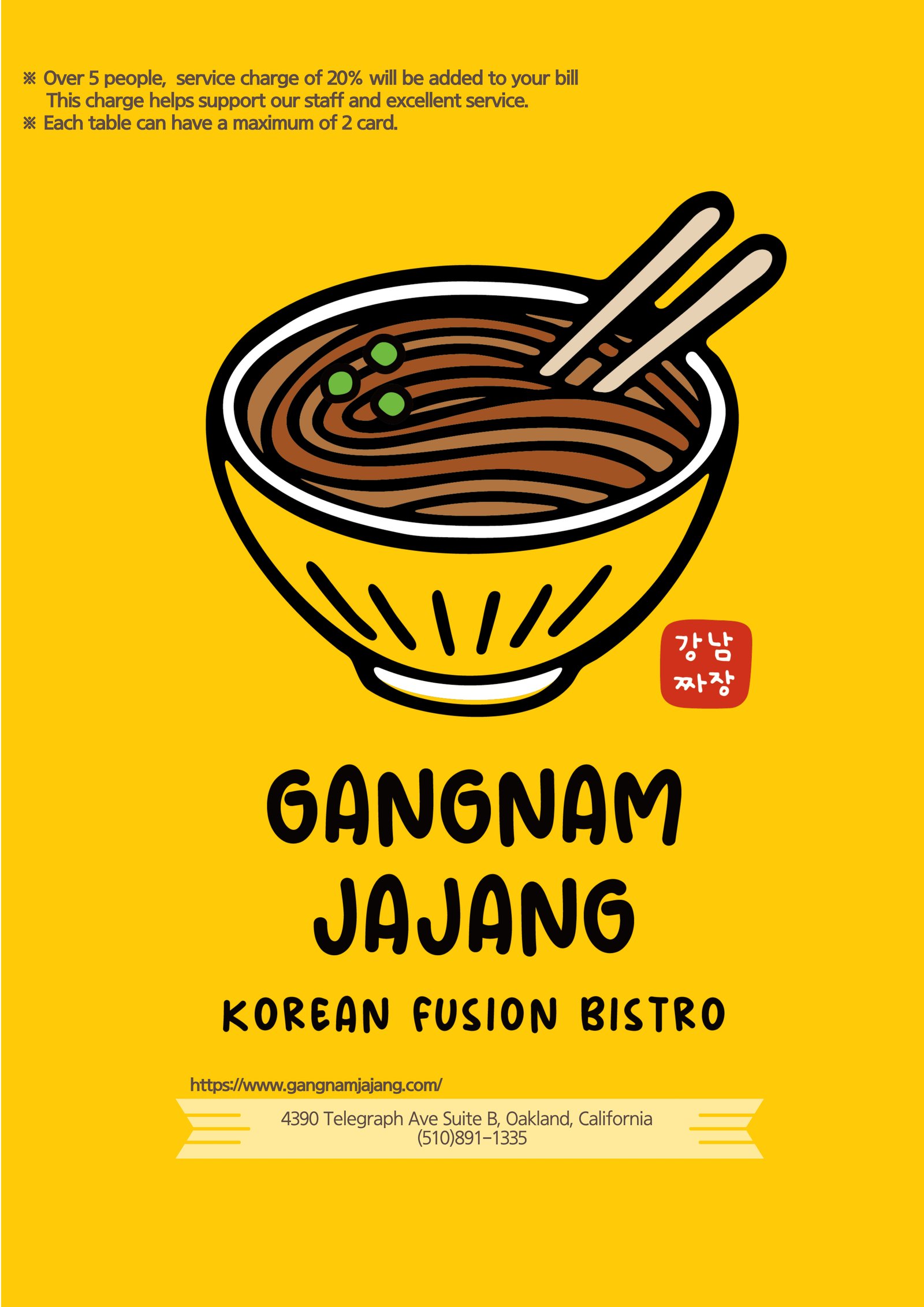 Gangnam Jajang is a Korean Fusion restaurant located in the Oakland area. We offer high quality, fusion Korean cuisine that includes Ja-Jang-Myeon, Jjam-Bbong, Tang-Soo-Yuk, Kkan-Pung-Gi and much more! Our special thing is to make noodles ourselves and the important ingredient of sauce was directly delivered from South Korea every week. Ja-Jang-Myeon(#1) is our special menu with vegetables, pork in a sweet, savory and black sauce. Jjam-Bbong(#3)is known as a spicy seafood noodle soup with various seafoods and vegetables. Tang-soo-Yuk(#5) is deep fried pork with sweet and sour sauce. In Particular, we highly recommend Kkan-Pung-Gi(from #13) in our place. There are several sauces for you to choose your own taste. If your kids tried our Popcorn Kkan-Pung-Gi, they might want to come back to our place! Our deep fried dishes are perfectly crunchy and not too greasy and the inside meat is moist and juicy.