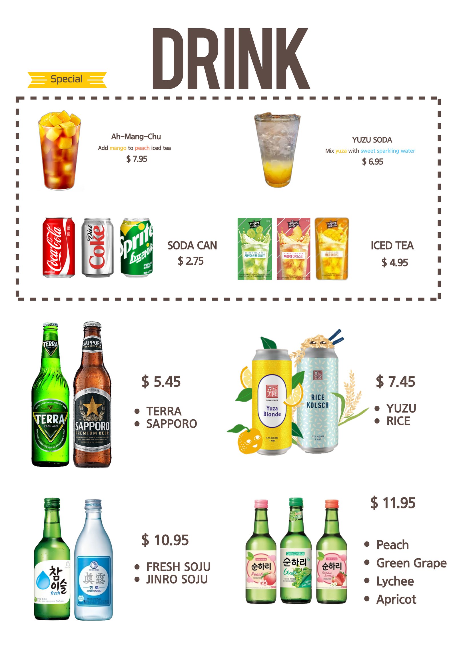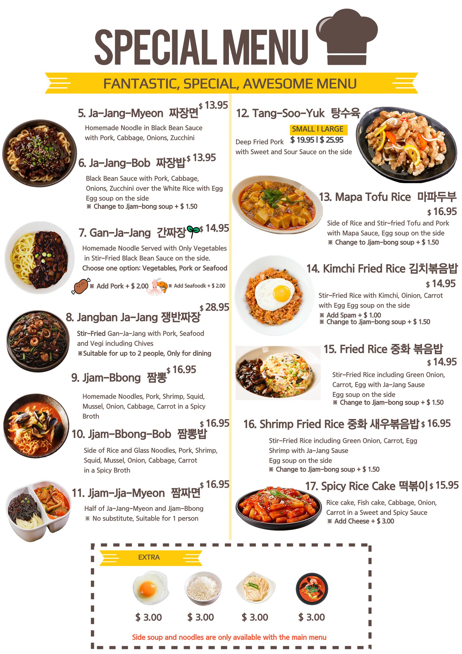 Ja-Jang-Myeon, Gan-Ja-Jang, Jjam-Bbong, Jjam-Jja-Myeon, Tang-Soo-Yuk, Mapa Tofu Rice, Kimchi Fried Rice and so on.